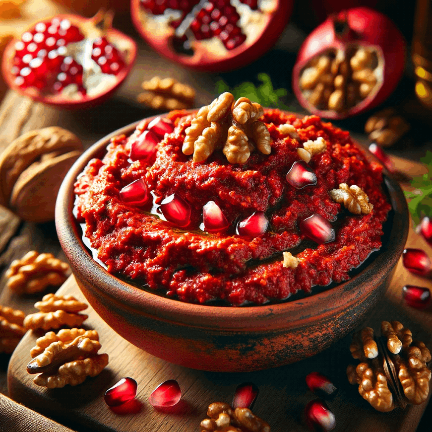 Indulge in the bold, vibrant flavors of Muhammara, a Middle Eastern masterpiece that combines the smoky sweetness of roasted red peppers, the earthy richness of walnuts, and the tangy brightness of pomegranate molasses.
