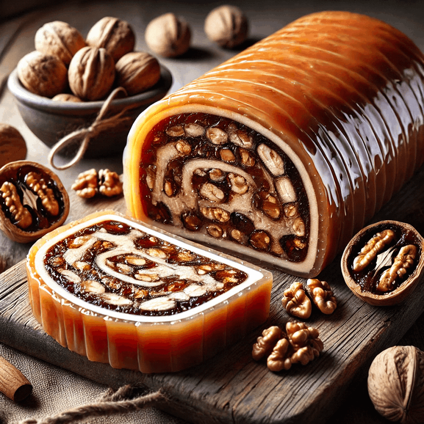 Roejig, a beloved Armenian sweet, combines walnuts and thickened grape juice for a chewy, festive treat.