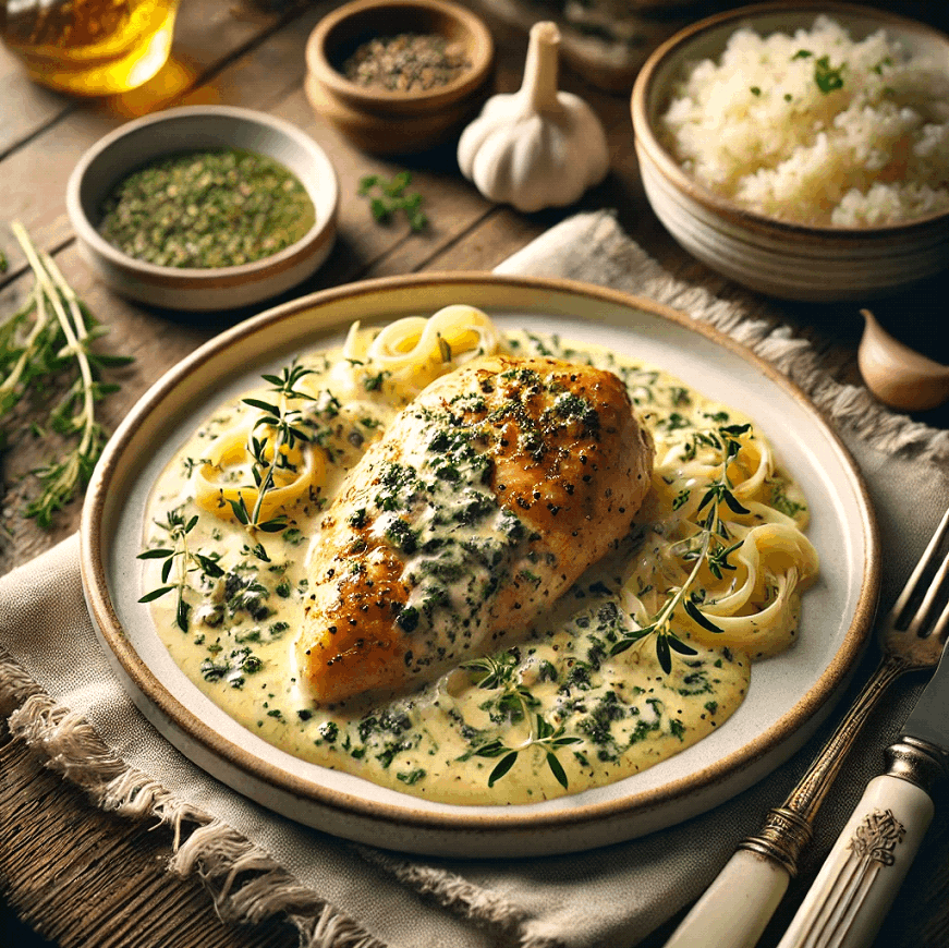 Delight in the subtle, herbal flavors of Chicken with Tarragon, a French classic that highlights the fresh, anise-like notes of tarragon in a creamy, savory sauce.