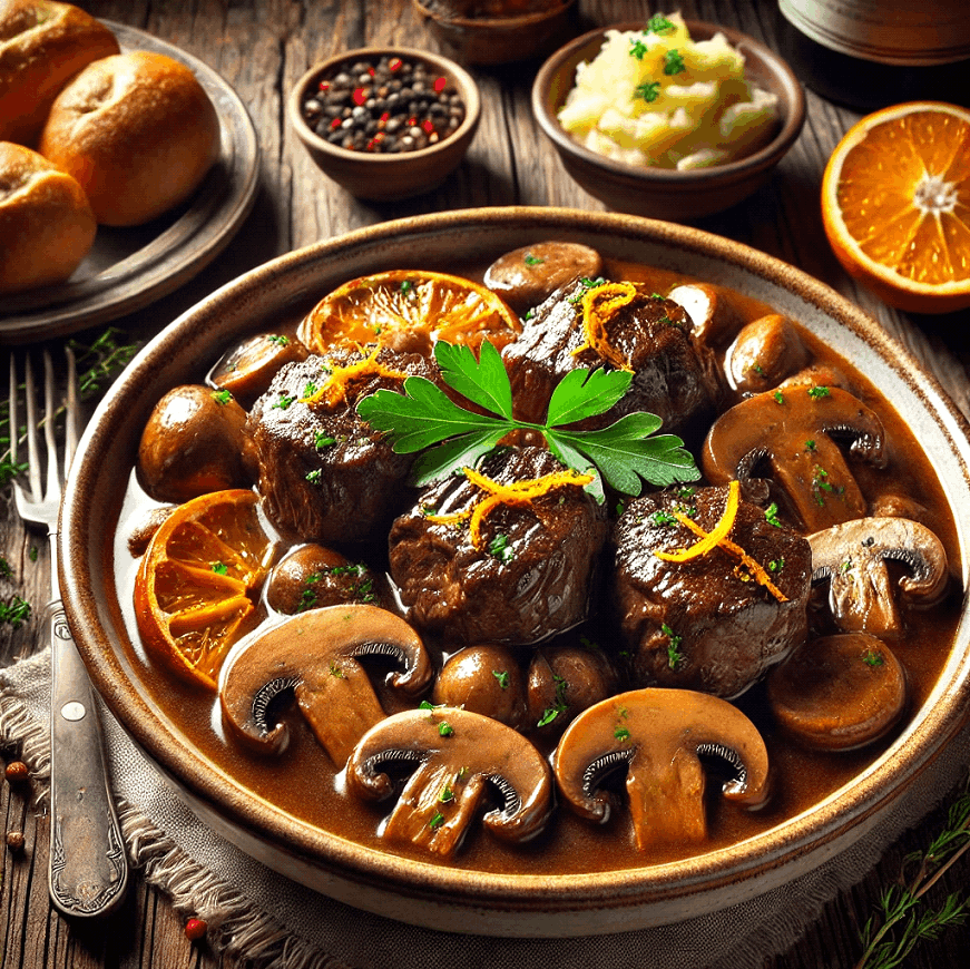 Indulge in the luxurious depth of Beef Daube with Porcini and Orange, a French stew that melds tender beef, earthy porcini mushrooms, and the bright zest of orange.