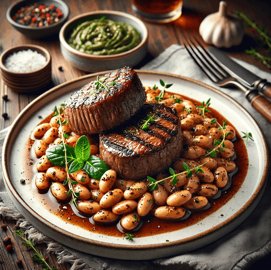 Treat yourself to a touch of French elegance with tender filet mignon served over creamy flageolet bean purée.