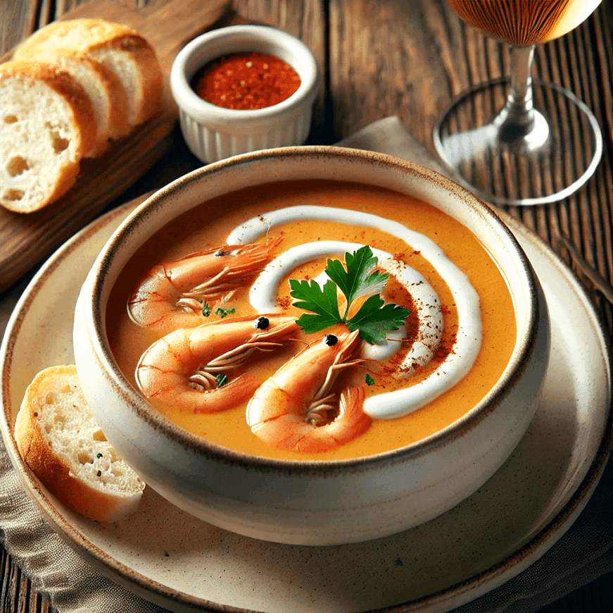 Immerse yourself in the luxurious flavors of Shrimp Bisque, a velvety French classic that highlights the sweet richness of shrimp in a creamy, aromatic broth.