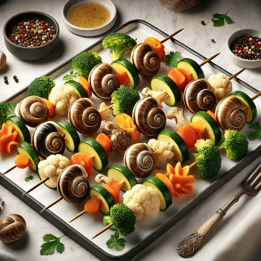 Delight your guests with Skewers of Snails, a French delicacy that combines tender snails with a medley of vibrant, steamed vegetables.