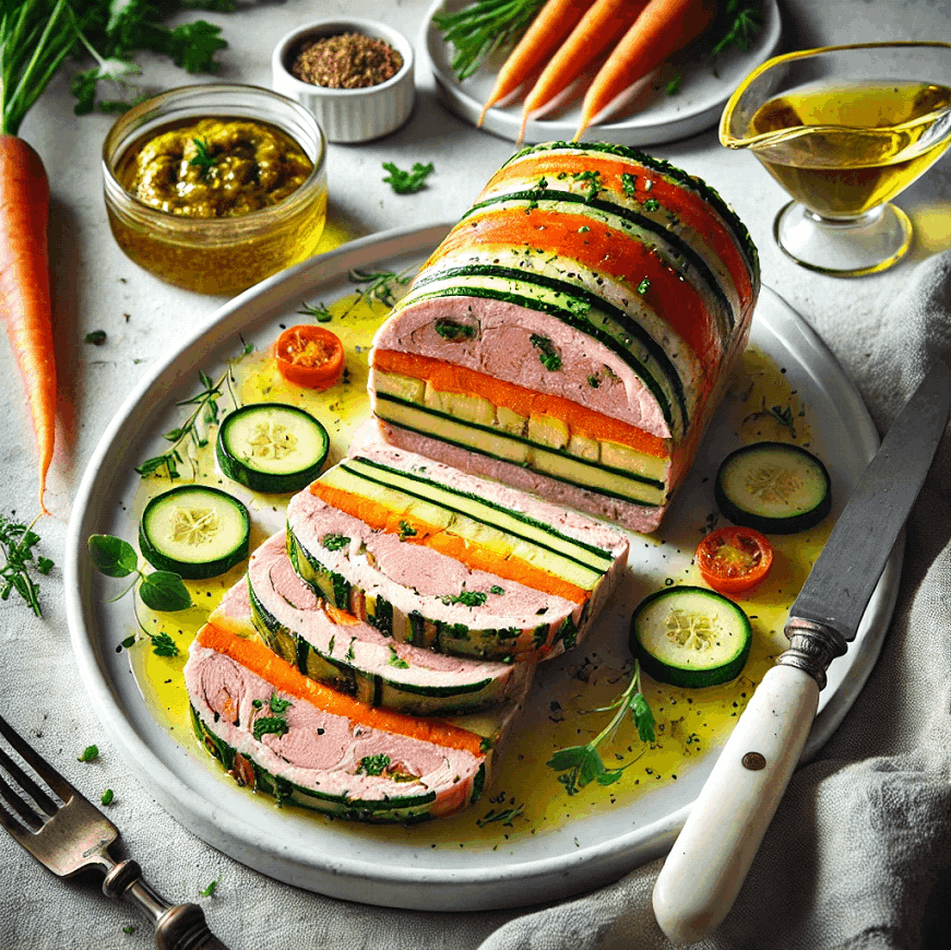 Elevate your meal with Turkey Terrine with Vegetables, a stunning dish that layers tender turkey strips with colorful vegetable sticks in a creamy, savory mixture.