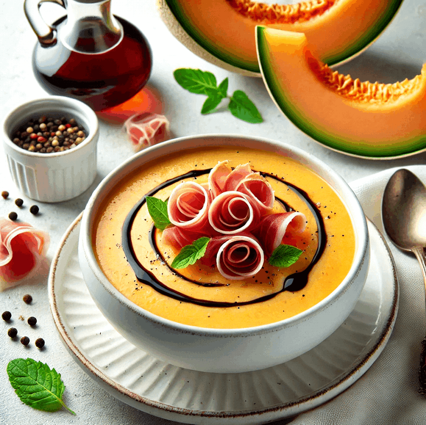 Indulge in the refreshing and luxurious flavors of Melon Soup with Port and Prosciutto, a sophisticated dish that blends the sweetness of ripe cantaloupe with the rich depth of Port wine and the savory touch of prosciutto.