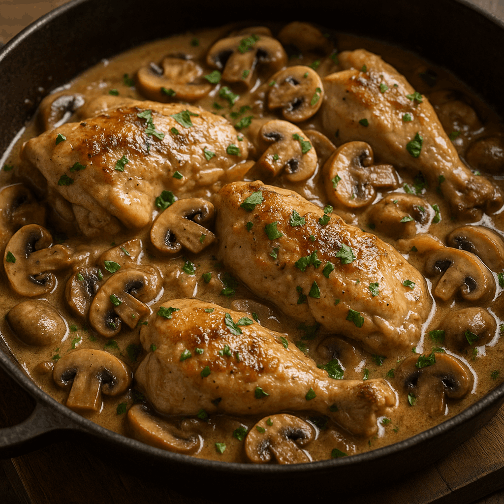 Savor the rich, comforting essence of Mushroom Chicken (Gombás Csirke) — a classic Hungarian dish that brings together tender, juicy chicken pieces and earthy, caramelized mushrooms in a luxurious, aromatic sauce infused with sweet onions, dry white wine, and fresh herbs.