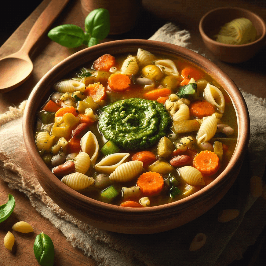 Enjoy a hearty Italian classic with fresh vegetables, protein-rich beans, and al dente pasta, topped with vibrant homemade pesto.