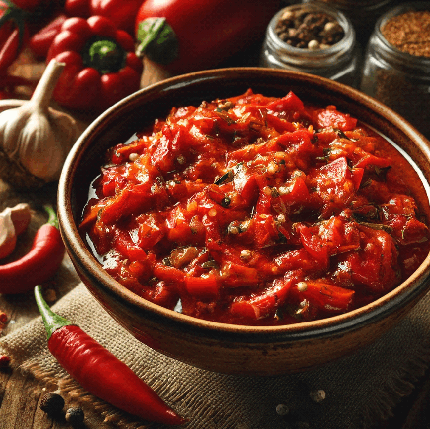 Indulge in the bold, vibrant flavors of Muhammara, a Middle Eastern masterpiece that combines the smoky sweetness of roasted red peppers, the earthy richness of walnuts, and the tangy brightness of pomegranate molasses.