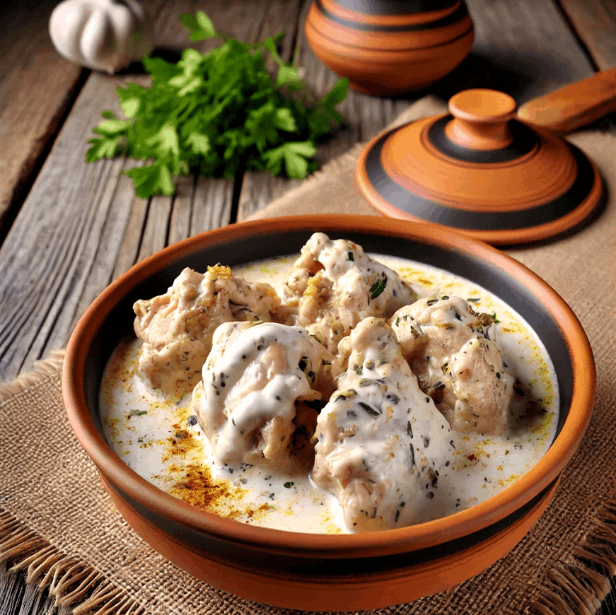 Savor tender roast chicken paired with a rich, tangy sauce made from light cream, yogurt, and fresh lemon juice.