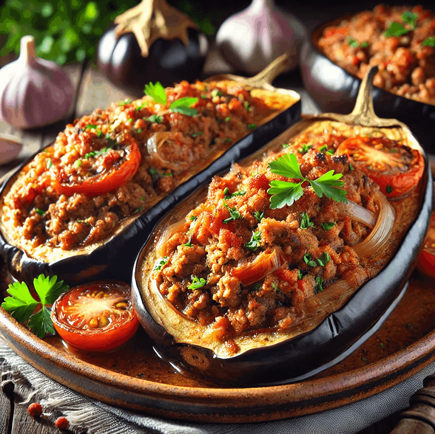 Savor the rich flavors of tender baked eggplant filled with spiced lamb, onions, and bell peppers.