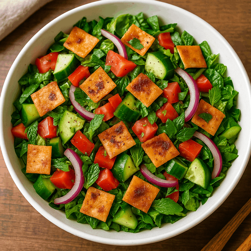 Fattoush is a vibrant and refreshing Middle Eastern salad known for its crispy toasted pita, fresh vegetables, and tangy sumac dressing.