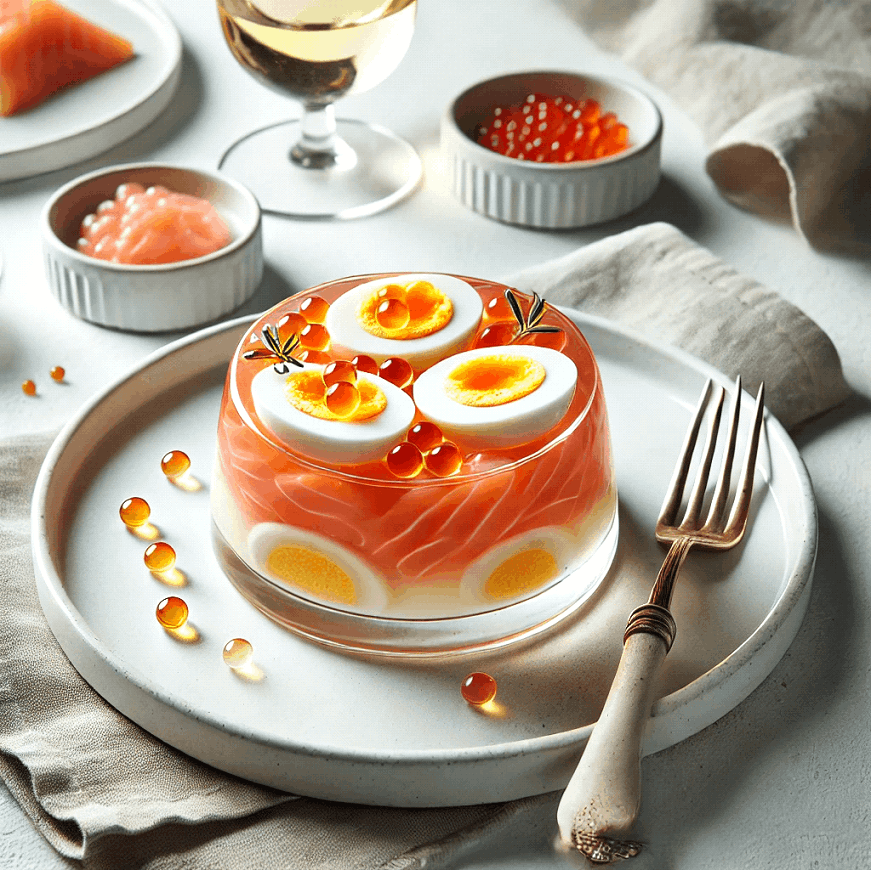 Delight in the sophisticated simplicity of Salmon and Eggs in Gelée, a dish that combines the delicate flavors of smoked salmon, rich salmon roe, and a shimmering gelée infused with fish essence.