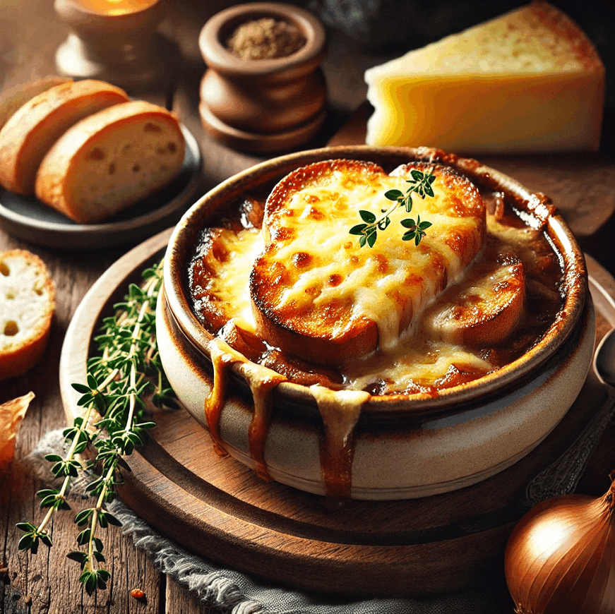 Warm up with the timeless appeal of French Onion Soup, a dish that embodies the heart of French culinary tradition. This rich and aromatic soup, made with caramelized onions, hearty beef stock, and topped with melted Gruyère cheese, is perfect for cozy nights or elegant gatherings.