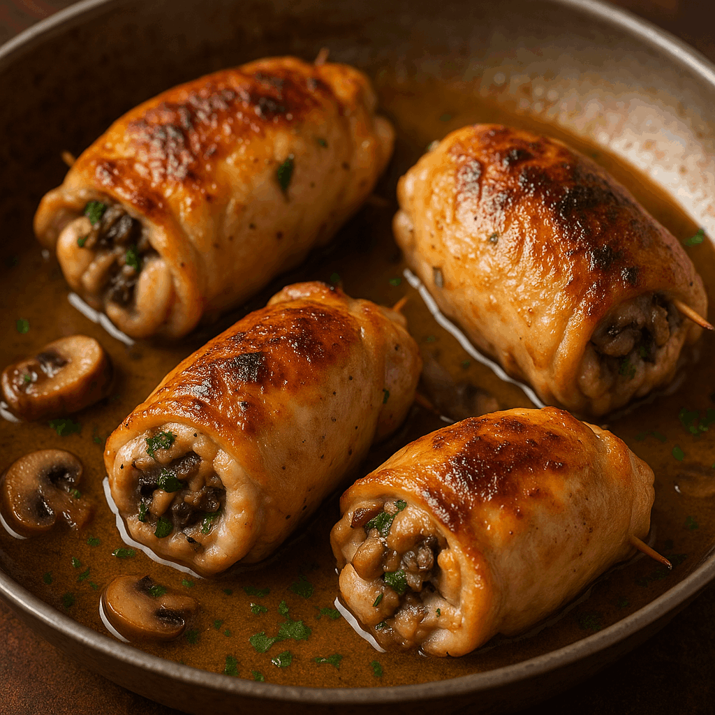 Tender, boneless chicken thighs are generously filled with a savory stuffing of finely chopped mushrooms, sweet caramelized onions, fresh herbs, and aromatic garlic, creating a moist, flavor-packed center.