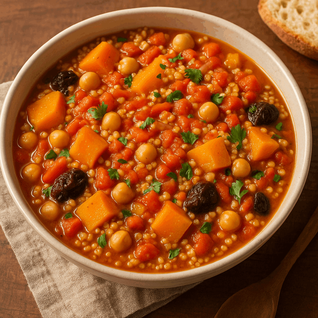 This nourishing dish features tender butternut squash, protein-rich chickpeas, and naturally sweet prunes simmered in a fragrant tomato broth, then finished with fluffy couscous and a sprinkle of fresh herbs.